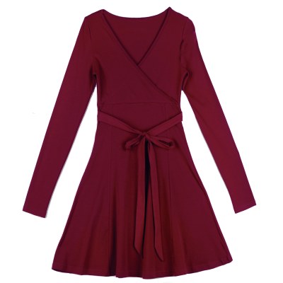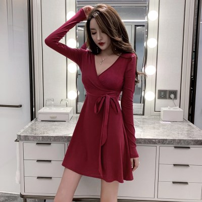 低胸性感连衣裙2022新款交叉V领绑带收腰显瘦长袖打底气质A字裙子