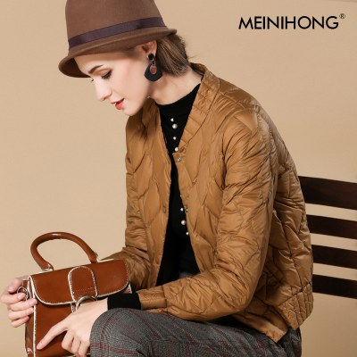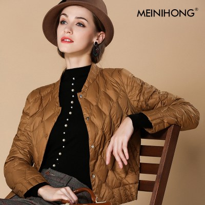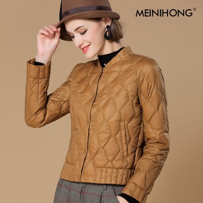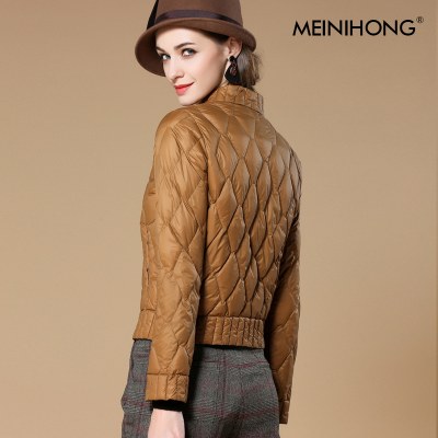 短款羽绒服女修身2021秋小个子秋冬款轻薄菱形格白鸭绒焦糖色外套